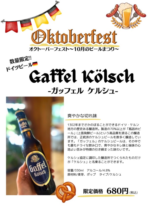 メニューリニューアル&数量限定ビールのお知らせ! いつもありがとうございます! 今月はオクトーバーフェスト🍻ということで 数量限定のドイツビールをご準備しています! モンヴェール農山では扱っていないタイプのドイツ・ケルンのケルシュビール🍺 美味しいと好評です!お早めにど…続きを読む